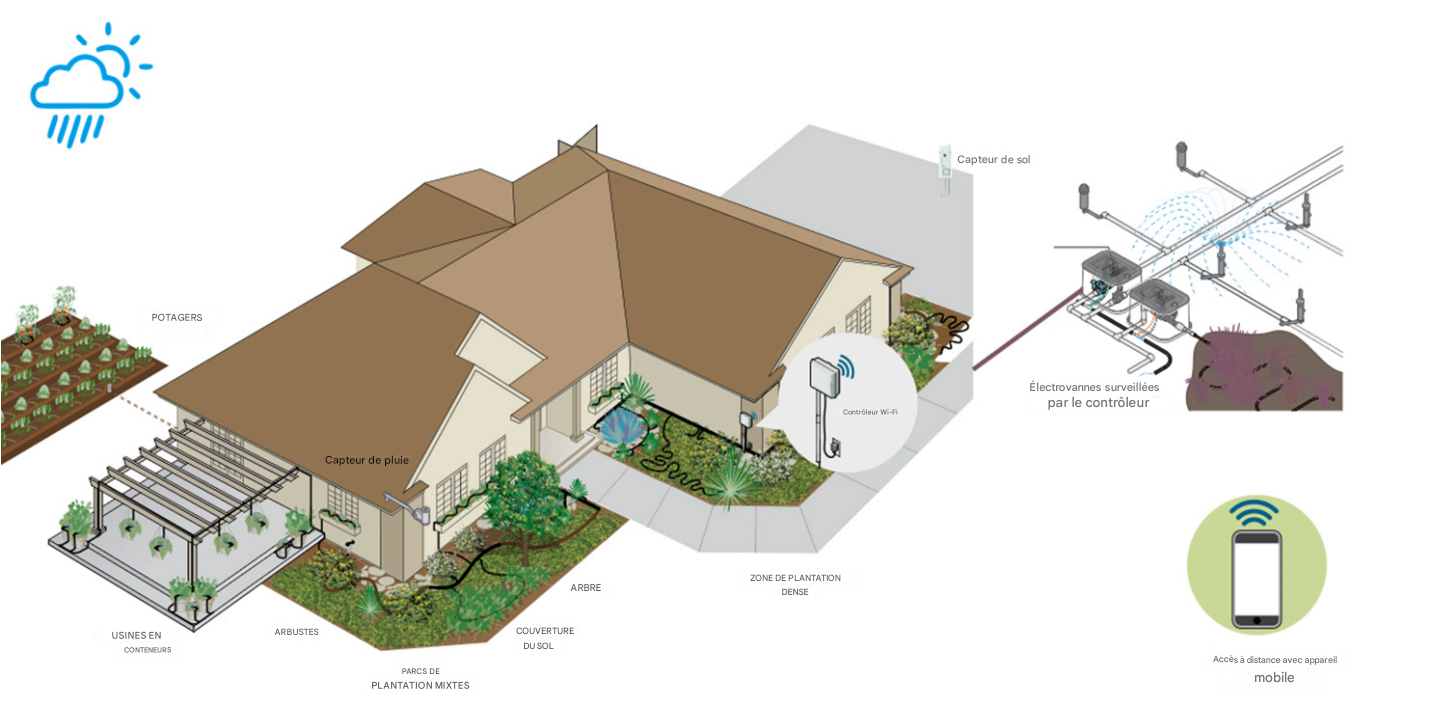 Réduction de la consommation d’eau et suspension automatique en cas de pluie ou lorsque le sol est suffisamment humide.