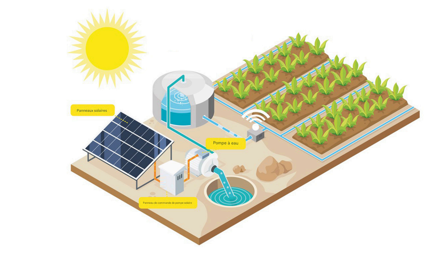 Elle puise l’eau efficacement à partir de diverses sources (puits, rivières ou lacs) en utilisant uniquement l’énergie solaire, assurant ainsi une solution durable et autonome.